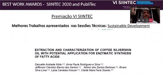 No dia 23 de outubro de 2020 a Dra. Danyelle Andrade Mota, aluna egressa do Programa de Pós-Graduação em Biotecnologia Industrial da Unit, recebeu a premiação de 1° colocado nas sessões técnicas no VI INTERNATIONAL SYMPOSIUM ON INOVATION AND TECNOLOGY (SIINTEC) com o trabalho intitulado “EXTRACTION AND CHARACTERIZATION OF COFFEE SILVERSKIN OIL WITH POTENTIAL APPLICATION FOR ENZYMATIC SYNTHESIS OF FATTY ACIDS” apresentado.