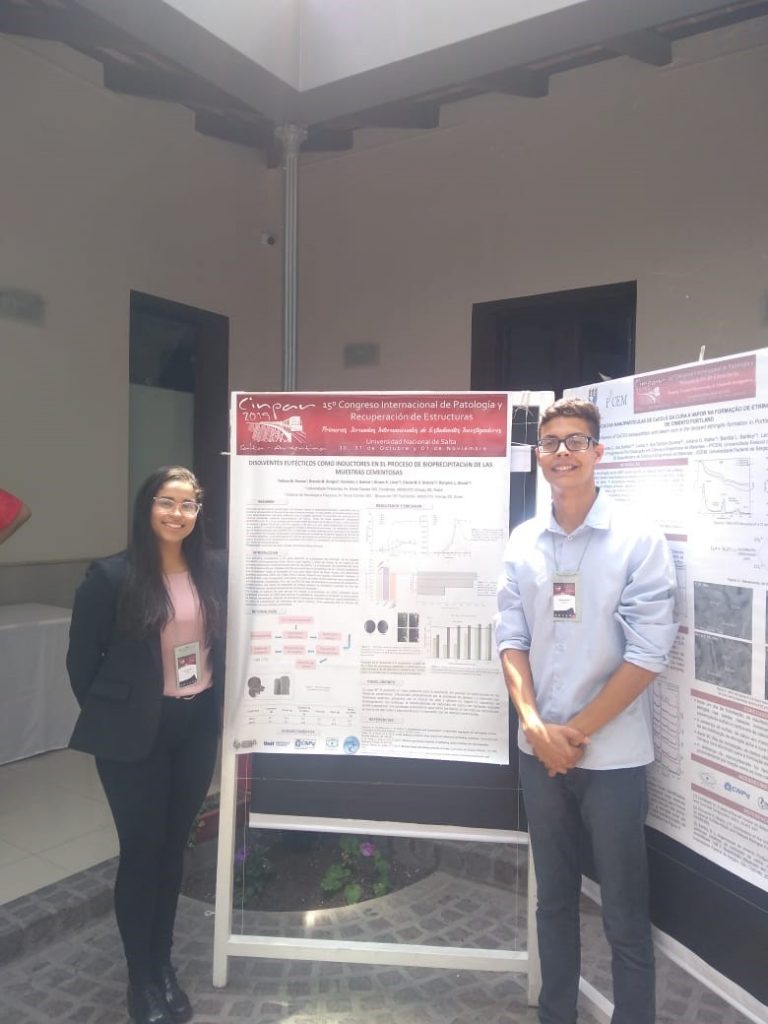 Os alunos Tatiane M. Ramos e Brendo M. Borges que realizaram Iniciação Científica sob orientação do Prof. Ranyere Lucena de Souza e da Profª. Cleide M. Soares do Programa de Pós-Graduação em Engenharia de Processos (PEP/UNIT) tiveram a oportunidade de apresentar o trabalho “Disolventes eutécticos como inductores en el proceso de bioprecipitación de las muestras cementosas” durante o 15º Congreso Internacional de Patología y Recuperación de Estructuras realizado em Salta, Argentina, entre os dias 30 de outubro e 01 de novembro de 2019. O evento é considerado um dos congressos mais importantes da América do Sul e da Península Ibérica, na área de Patologia e Reabilitação de Estruturas. A pesquisa é focada na busca por microrganismos capazes de mediar a bioprecipitação de minerais com a finalidade de realizar um processo de autocura de fissuras em materiais cimentícios.