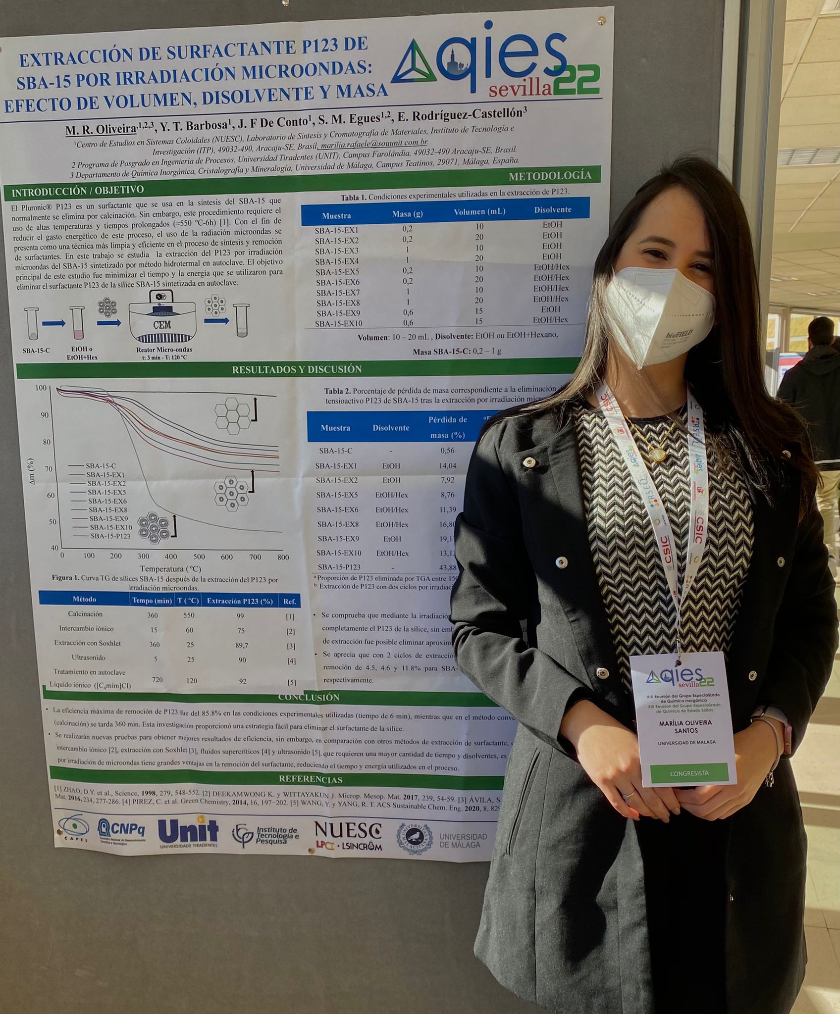 Entre os dias 31 de janeiro a 02 de fevereiro de 2022 aconteceu em Sevilla (Espanha) o QIES22 (XIX Reunión Bienal del Grupo Especializado de Química Inorgánica y XIII Reunión Bienal del Grupo Especializado de Química del Estado Sólido de la RSEQ). O programa de pós-graduação em Engenharia de Processos (PEP) da Universidade Tiradentes (UNIT) e o Instituto de Tecnologia e Pesquisa (ITP) foram representados pela presença das alunas de doutorado Aline Resende Dória orientada pelos doutores Katlin Ivon Barrios Eguiluz e Giancarlo Richard Salazar Banda, e Marília Rafaele Oliveira Santos sob orientação das doutoras Silvia Maria Egues, Elton Franceschi e Juliana Faccin de Conto, as quais apresentaram três trabalhos na forma de comunicação pôster e oral.