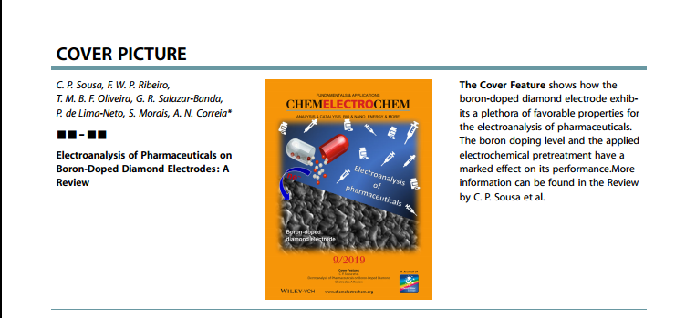 Electroanalysis of Pharmaceuticals on Boron-Doped Diamond Electrodes: A Review, Camila Pinheiro Sousa, Francisco Wirley Paulino Ribeiro, Thiago Mielle Brito Ferreira Oliveira, Giancarlo R. Salazar-Banda, Pedro de Lima-Neto, Simone Morais, and Adriana Nunes Correia, DOI: 10.1002/celc.201801742