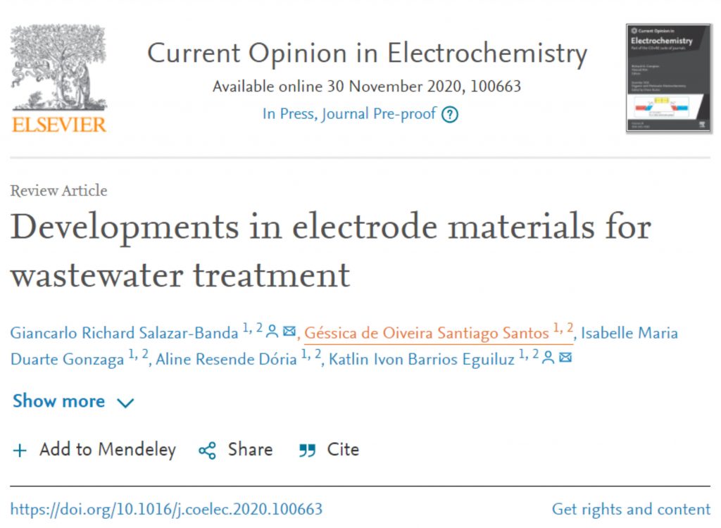 Recentemente, foi aceito o artigo “Developments in electrode materials for wastewater treatment” na revista internacional Current Opinion in Electrochemistry pertencente ao grupo Elsevier.