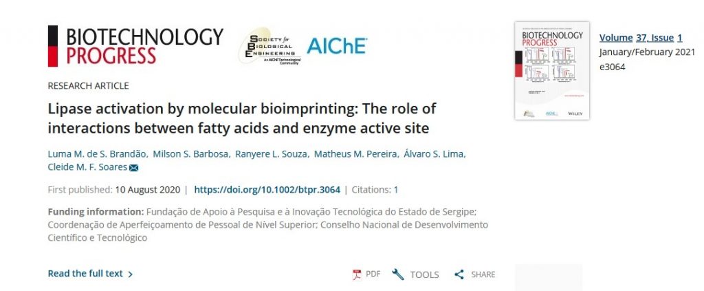 Recentemente, janeiro 2021, o grupo de Biocatálise do PEP foi agraciado com a capa na revista científica Biotechnology Progress do trabalho intitulado “Lipase activation by molecular bioimprinting: The role of interactions between fatty acids and enzyme active site” fruto do mestrado em Engenharia de Processos da aluna Luma M. de S. Brandão sob a orientações do Prof. Dr. Álvaro Silva Lima (UNIT), Profa. Dra Cleide M F Soares (UNIT) e Prof. Dr. Matheus Mendonça Pereira (UA) (https://aiche.onlinelibrary.wiley.com/doi/10.1002/btpr.3018). A pesquisa é uma parceria do PEP/Universidade Tiradentes (UNIT) com o Laboratório Associado CICECO – Instituto de Materiais de Aveiro, denominado anteriormente CICECO – Centro de Investigação em Materiais Cerâmicos e Compósitos, Departamento de Química da Universidade de Aveiro – Portugal. Ainda temos a imensa colaboração na equipe do aluno de doutorado do PEP Milson S. Barbosa e Prof. Dr. Ranyere L. Souza.