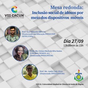 [:pt]Os doutorandos do Programa de Pós-graduação em Educação da Universidade Tiradentes Kaio Eduardo Oliveira, André Alves e Cynara Maria dos Santos integram a mesa redonda Inclusão social de idosos por meio dos dispositivos móveis, no VIII Congresso Acadêmico da Uncisal no estado de Alagoas. O evento tem como tema Promoção da Saúde e inclusão social – 50 anos depois e é realizado pela Universidade Estadual de Ciências da Saúde de Alagoas. Os três são doutorandos do PPED e são orientandos pela professora doutora Cristiane Porto.