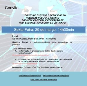 [:pt]O Programa de Pós-graduação em Educação da Universidade Tiradentes (PPED-UNIT) e o Grupo de Estudos e Pesquisas em politicas públicas, gestão socioeducacioal e formação de professores (GPGFOP/PPED/UNIT/CNPQ), liderado pela professora doutora Rita de Cássia Amorim Barroso convidam a comunidade acadêmica para a reunião grupo.