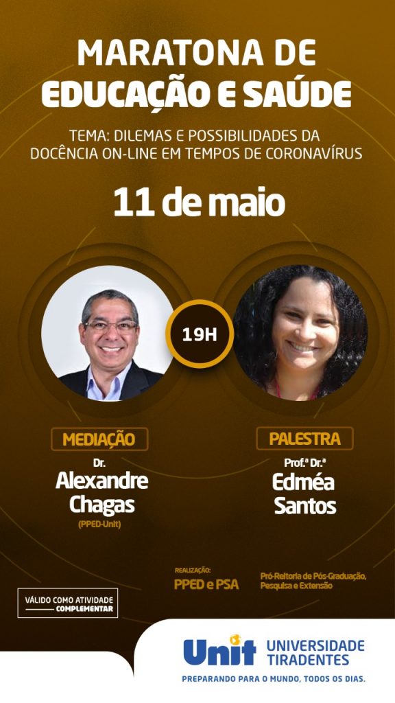 O isolamento social exige que as pessoas fiquem em casa e adaptem suas rotinas, seja de trabalho ou de estudos. A tecnologia tem sido aliada desse momento de mudanças provocado pela pandemia de Covid-19 e instrumento de conhecimento para os Programa de Mestrados e Doutorados da Universidade Tiradentes (Unit), o PPED, o qual realiza a primeira Maratona de Educação e Saúde. O evento começou nesta segunda-feira (11) e terá sequência dias 18 e 25, com transmissão pelo youtube.