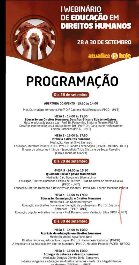 O Programa de Pós-Graduação em educação e em Direitos Humanos da Unit o PPGEdu-UFRGS e VIRTUS -PPGFIL- UFPE) (MNDH) e a OAB Sergipe convidam para WEBINÁRIO EDUCAÇÃO EM DIREITOS HUMANOS. O evento acontecerá entre os dias 28 a 30/09/20 e terá em sua programação seis mesas temáticas com a presença de Professoras e Professores, Pesquisadoras e Pesquisadores de Programas de Pós-Graduação das Universidades Tiradentes e Universidade Federal de Sergipe, da Universidade Federal do Rio Grande do Sul, da Universidade Federal de Pernambuco, da Faculdade Visconde de Cairu da Bahia, de Escola da Educação Básica e do Movimento Nacional de Direitos Humanos, abordando a Educação em Direitos Humanos, seus desafios e possibilidades face à conjuntura atual. O seminário é organizado pelos Programas de Pós-Graduação em Direito (PPGD – UNIT) e Pós-Graduação em Educação – (PPED- UNIT) da Universidade Tiradentes em parceria com os Programas de Pós-Graduação em Educação (PPGEdu) da Universidade Federal do Rio Grande do Sul-(UFRGS), pelo Programa de Pós-Graduação em Filosofia (PPGFIL- UFPE) através do Grupo de Pesquisa VIRTUS e pelo Movimento Nacional de Direitos Humanos (MNDH) e tem o apoio da OAB Sergipe. O Seminário será gratuito e ocorrerá através do Youtube por meio dos links abaixo: