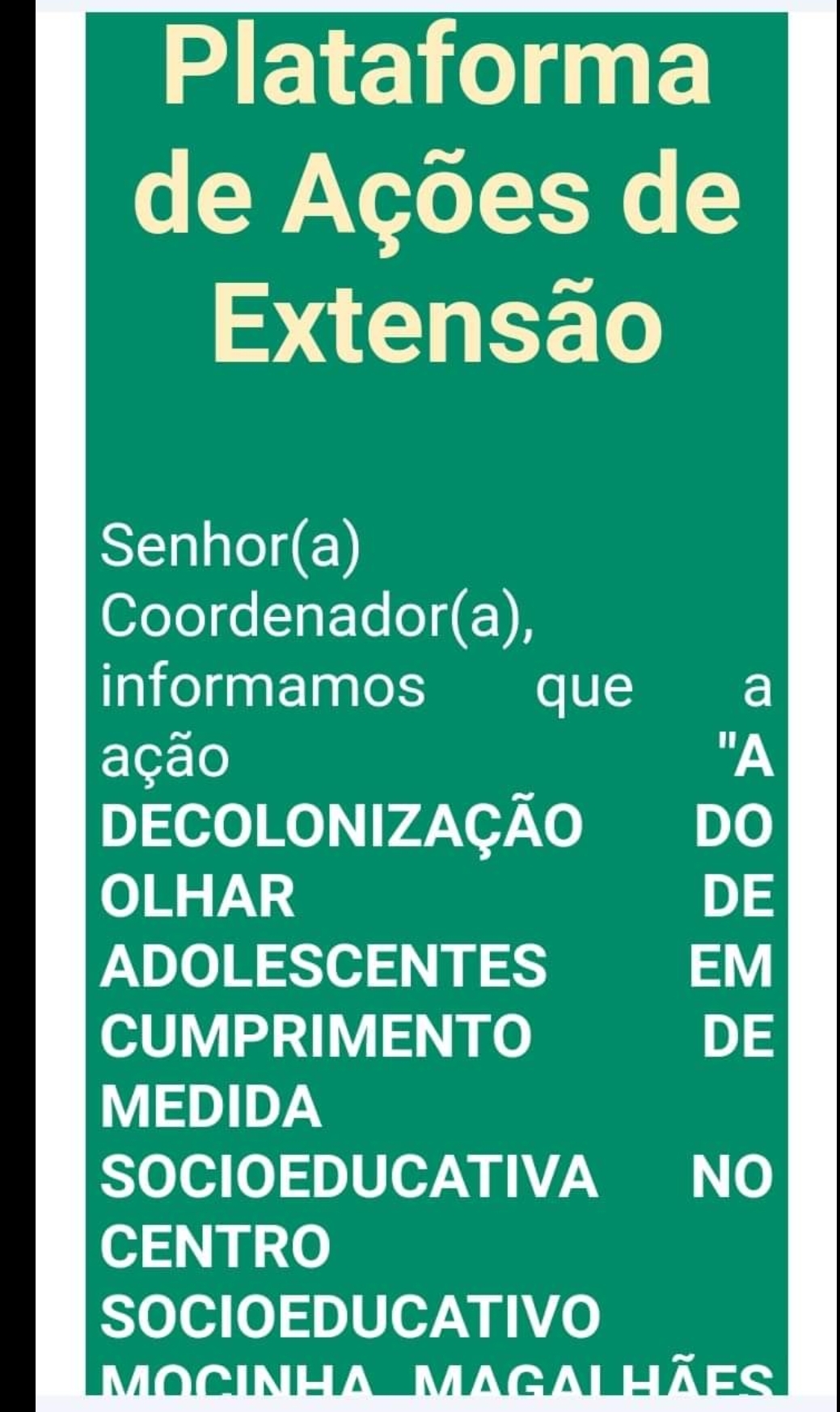 A professora doutora Maria Salete Peixoto Gonçalves, docente da Universidade Federal do Acre (Ufac) egressa dos cursos de Mestrado e Doutorado do Programa de Pós-graduação em Educação da Universidade Tiradentes PPED/UNIT), comemora com seus colaboradores acadêmicos a aprovação do projeto A Decolonização do Olhar de Adolescentes em Cumprimento de Medida Socioeducativa no Centro Socioeducativo “Mocinha Magalhães”- Acre, comfinanciamento na Plataforma de Ações de Extensão e Cultura (Proec) e homologado pelo PROEX. O projeto será aplicado com as adolescentes que cumprem medidas restritivas na unidade da capital acreana, a única daquele estado que recebe em somente adolescentes do sexo feminino. Rio Branco é uma das 10 cidades brasileiras com os maiores percentuais de meninas em cumprimento de medida privativa de liberdade ou semiliberdade. A professora Salete ressalta que a proposta do projeto pode trazer especificidades no cumprimento das medidas socioeducativas de internação e semiliberdade, sobretudo no que tange aos marcos de gênero, sexualidade, raça e classe. Terá duração de 06 meses, com colaboração de bolsistas e aberta em eventos presenciais e online de abrangência nacional e internacional.