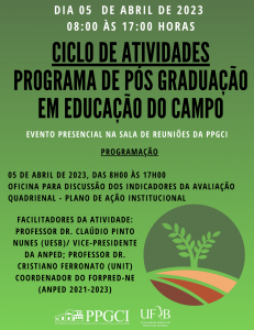 [:pt]O Coordenador do Programa de Pós-graduação em Educação (mestrado e doutorado) da Universidade Tiradentes, e Coordenador do Fórum de Coordenadores de Programas de Pós-Graduação em Educação da Região Nordeste-FORPRED/NE/ANPED, esteve no mês de abril em atividades junto aos Programas de Pós-graduação em Educação da Universidade Federal do Recôncavo da Bahia-UFRB e Universidade Federal da Paraíba-UFPB. No Programa de Pós-Graduação em Educação do Campo (PPGEDUCAMPO), da UFRB, a atividade, em parceira com o Professor Doutor Cláudio Pinto Nunes, da UESB e ANPED, envolveu dois dias de reuniões junto ao corpo docente daquela Programa, com vistas ao alinhamento do PPG para o Planejamento estratégico e a avaliação quadrienal em andamento. A convite da Pró-Reitoria de Pesquisa, Pós-Graduação, Criação e Inovação – PPGCI e do Coordenação do PPGEDUCAMPO), na pessoa do Professora Doutora Ana Cristina Nascimento, também vice-coordenadora do FORPRED/NE/ANPED, os professores coordenaram a atividade Discussão dos Indicadores da Avaliação Quadrienal – Plano de Ação Institucional, no CICLO DE ATIVIDADES DO PROGRAMA DE EDUCAÇÃO NO CAMPO.
