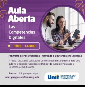 [:pt]A Coordenação do Programa de Pós-Graduação em Educação (Mestrado/Doutorado) da Universidade Tiradentes convida a toda a comunidade acadêmica para a Aula Aberta da disciplina Educação e Mídias: Las competencias digitales, ministrada pela Professora Doutora Sonia Cassillas, da Universidade de Salamanca-Espanha.