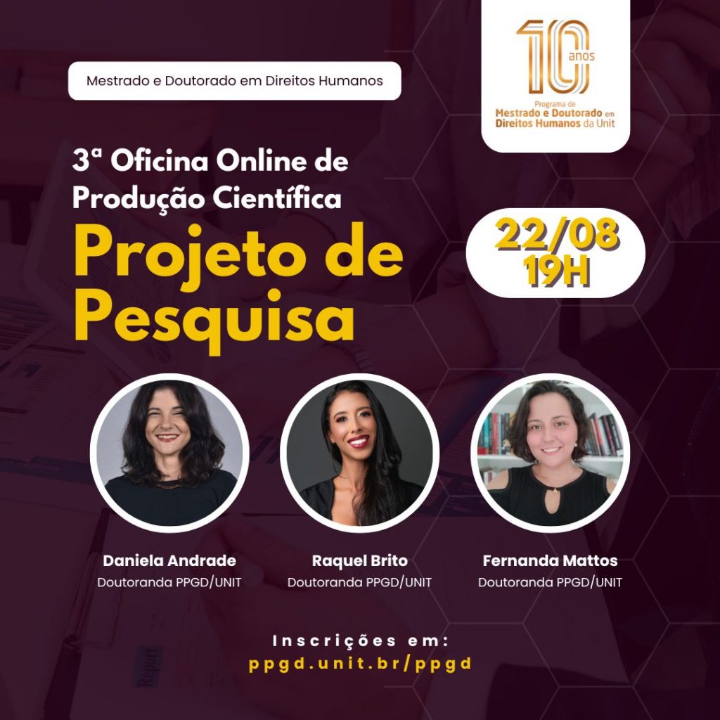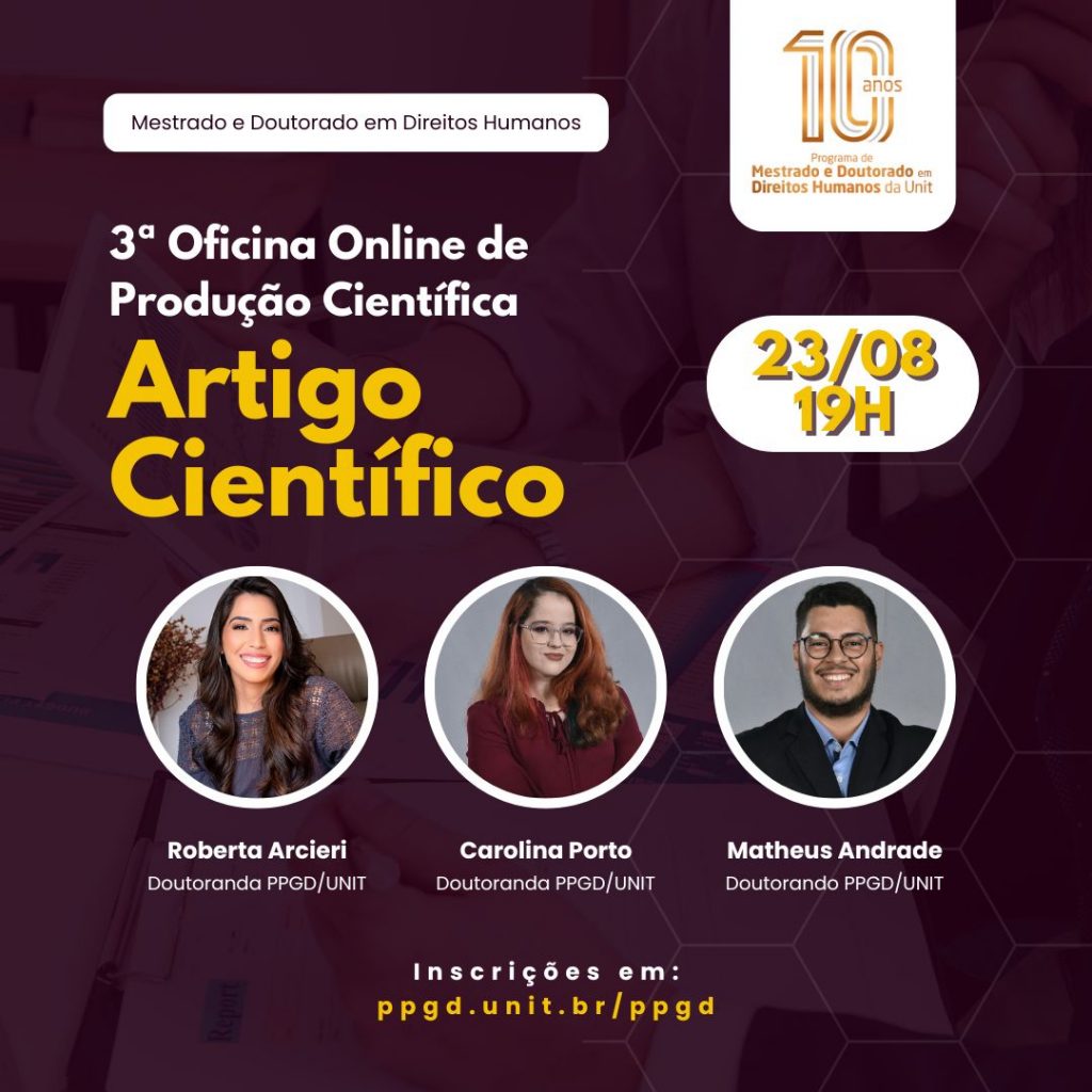 O Programa de Pós-Graduação em Direitos Humanos da Universidade Tiradentes (PPGD/UNIT) convida toda comunidade para acompanhar a Oficina Online de Produção Científica, ministrada pelos discentes bolsistas de Doutorado do Programa.