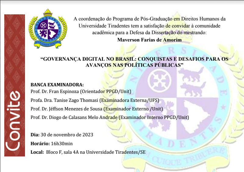 A Coordenação do Programa de Pós-graduação em Direitos Humanos, Mestrado e Doutorado, da Universidade Tiradentes/SE tem a satisfação de convidar a comunidade acadêmica para a defesa do(a) mestrando(a) Maverson Farias de Amorim a realizar-se, quinta-feira, 30 de novembro de 2023, às 16h30, na sala 4A do bloco F do campus Farolândia.