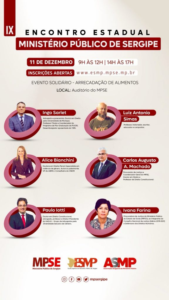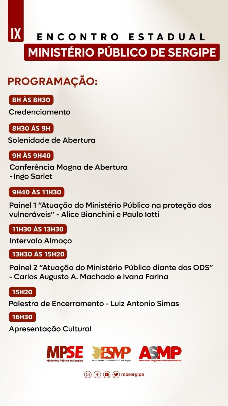 “O maior evento do Ministério Público de Sergipe está de volta! Vem aí o IX Encontro Estadual do MPSE, uma realização da Escola Superior e da Coordenadoria-Geral, em parceria com a Associação Sergipana do Ministério Público (ASMP). O evento, que está em sua nona edição, vai ocorrer no dia 11 de dezembro, nos turnos da manhã e tarde, no Auditório Promotor de Justiça Valdir de Freitas Dantas e é aberto aos integrantes da Casa e demais interessados.