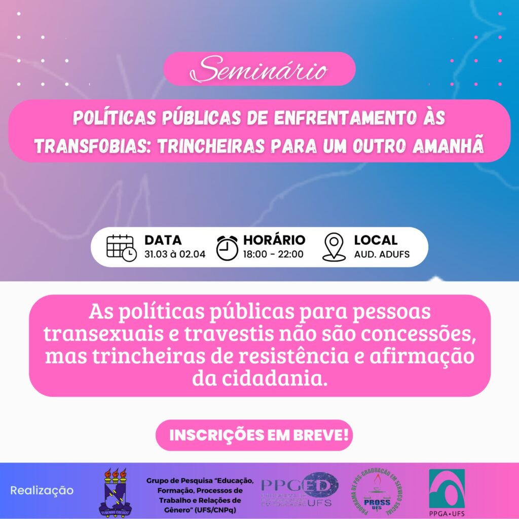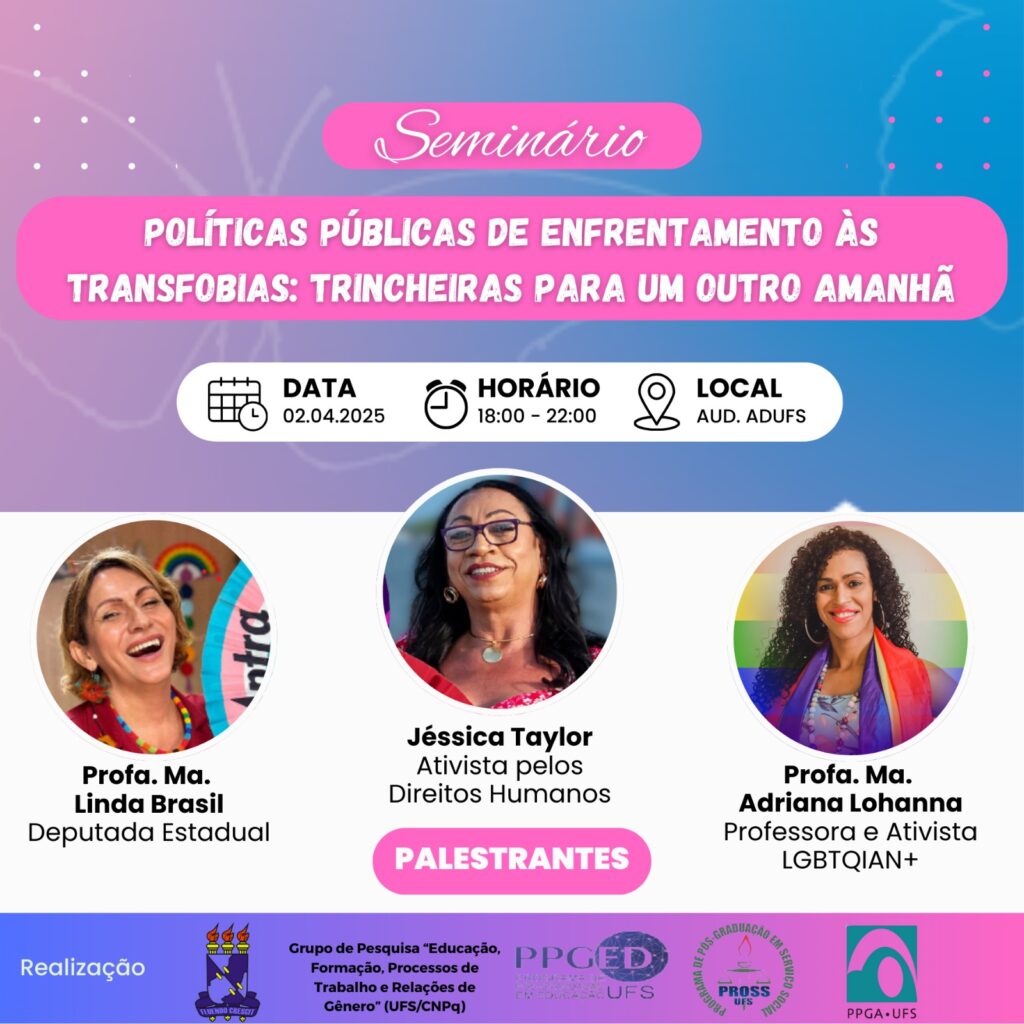 O evento integra as atividades do Grupo de Pesquisa “Educação, Formação, Processos de Trabalho e Relações de Gênero” (UFS/CNPq), coordenado pela Profa. Dra. Maria Helena Santana Cruz, e reafirma o compromisso acadêmico com a produção de conhecimento crítico e o desenvolvimento de políticas públicas comprometidas com os direitos humanos das pessoas transexuais e travestis.