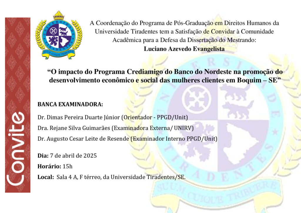 A Coordenação do Programa de Mestrado e Doutorado em Direitos Humanos da Universidade Tiradentes/SE tem a satisfação de convidar a comunidade acadêmica para a defesa da dissertação do mestrando Luciano Azevedo Evangelista, a realizar-se em 07 de maio de 2025, às 15h, na sala 4-A, bloco F do campus Farolândia.