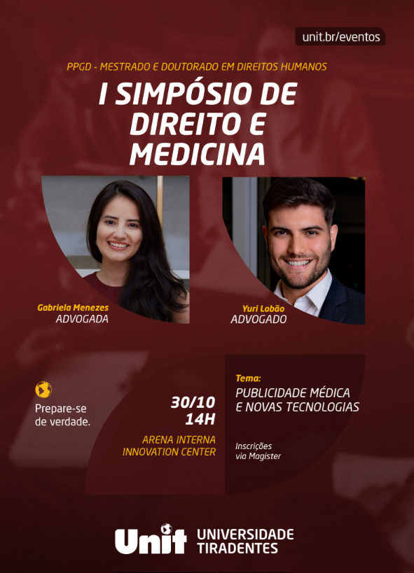 O Programa de Mestrado e Doutorado em Direito da Universidade Tiradentes (PPGD/UNIT) promoverá, no dia 30 de outubro, às 14h, o I Simpósio de Direito e Medicina, que acontecerá na Arena Interna do Innovation Center. O evento, voltado a estudantes, pesquisadores e profissionais das áreas jurídica e médica, discutirá o tema “Publicidade Médica e Novas Tecnologias”, com foco nas transformações éticas e regulatórias decorrentes da digitalização da comunicação profissional na saúde.