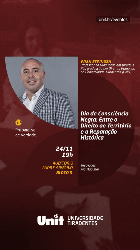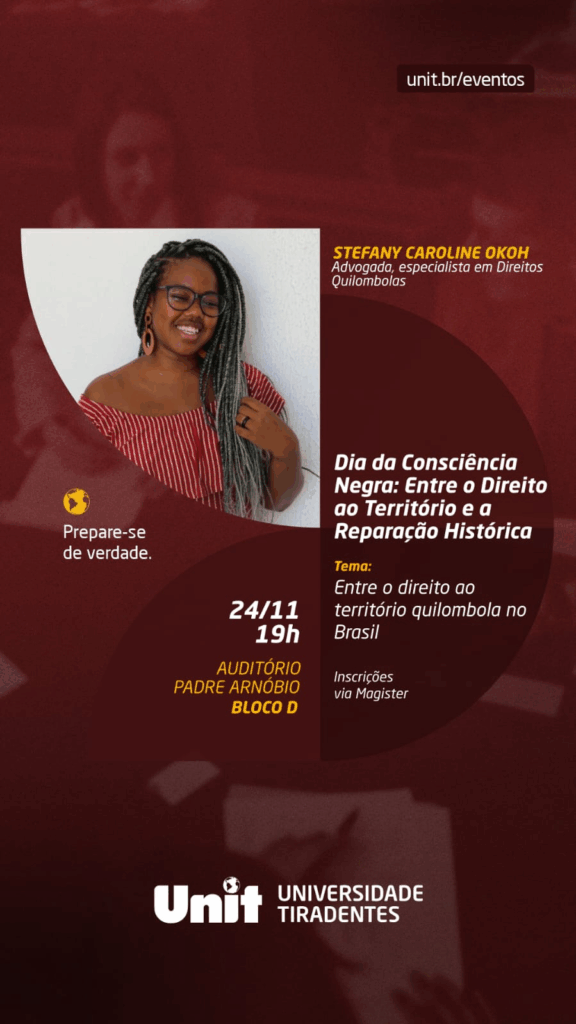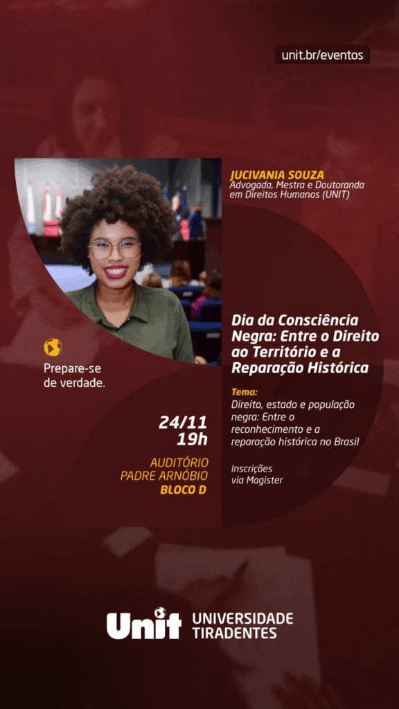 O Programa de Mestrado e Doutorado em Direito da Universidade Tiradentes (PPGD/UNIT) tem a satisfação de divulgar o evento “Dia da Consciência Negra: Entre o Direito ao Território e a Reparação Histórica”, promovido pela Graduação em Direito da UNIT, que será realizado no dia 24 de novembro, às 19h, no Auditório Padre Arnóbio – Bloco D.