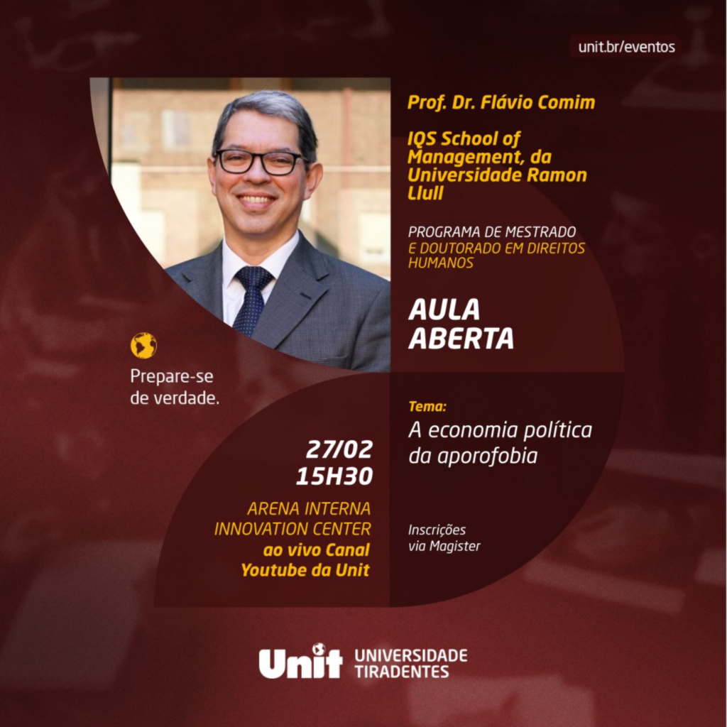 No dia 27 de fevereiro, às 15h30, o Programa de Mestrado e Doutorado em Direitos Humanos da Universidade Tiradentes realizará uma Aula Aberta com o Prof. Dr. Flávio Comim, docente da IQS School of Management, da Universidade Ramon Llull.