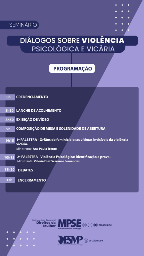 A Escola Superior do Ministério Público de Sergipe (ESMP), em parceria com o Centro de Apoio Operacional dos Direitos da Mulher (CAOp Mulher), promoverá o seminário “Diálogos sobre violência psicológica e violência vicária”, que será realizado no dia 20 de março, das 9h às 12h, no auditório do Ministério Público de Sergipe (MPSE), em Aracaju.