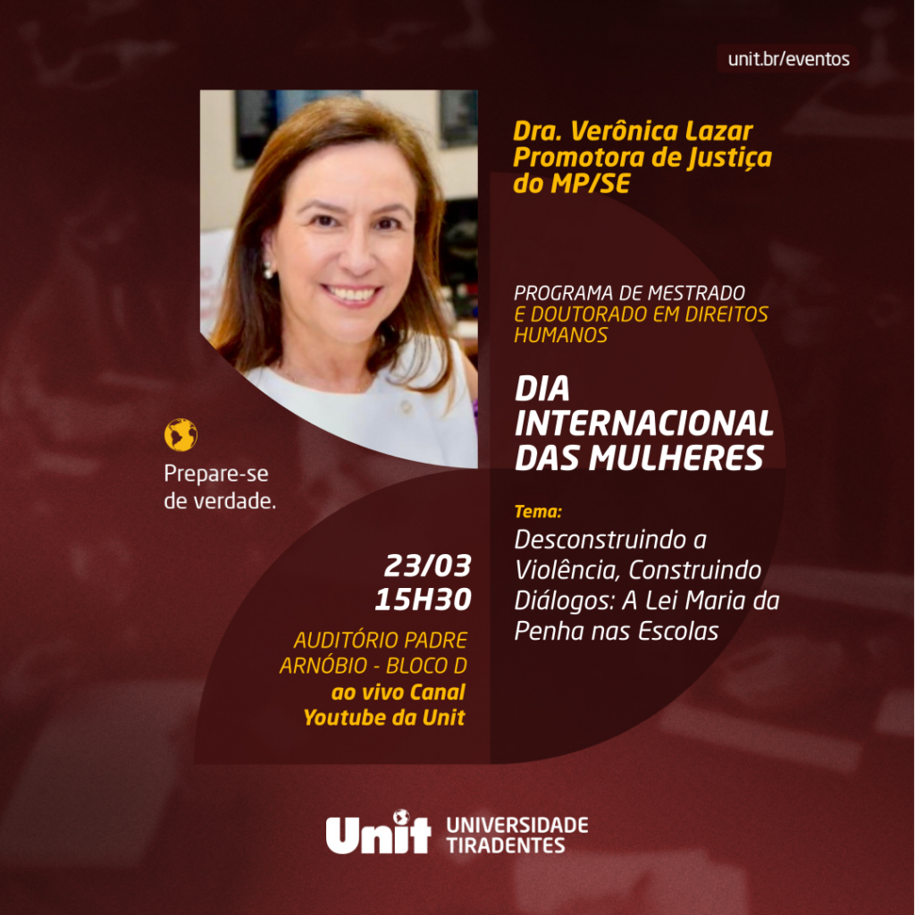 O Programa de Pós-Graduação em Direitos Humanos da Universidade Tiradentes (PPGD/Unit) realizará, no dia 23 de março, às 15h30, uma palestra especial em alusão ao Dia Internacional das Mulheres. O evento acontecerá no Auditório Padre Arnóbio, Bloco D, com transmissão ao vivo pelo canal do YouTube da Unit.