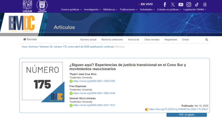 O Programa de Pós-Graduação em Direitos Humanos da Universidade Tiradentes (PPGD-UNIT) celebra a publicação de artigo científico produzido por docente, discente e egressa do programa em periódico internacional de referência na área jurídica. O trabalho foi divulgado no Boletín Mexicano de Derecho Comparado, revista vinculada à Universidad Nacional Autónoma de México (UNAM) e reconhecida no cenário acadêmico latino-americano.
