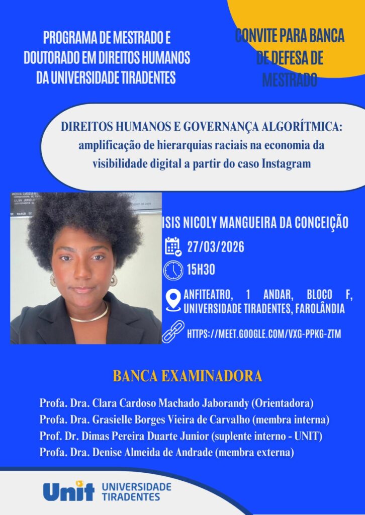 A Coordenação do Programa de Pós-Graduação em Direitos Humanos da Universidade Tiradentes (PPGD/UNIT) convida a comunidade acadêmica e o público em geral para a defesa de dissertação de mestrado de Ísis Nicoly Mangueira da Conceição, a ser realizada no dia 27 de março de 2026 (sexta-feira), às 15h30, no Anfiteatro, 1º andar, Bloco F, da Universidade Tiradentes, Campus Farolândia, com possibilidade de acompanhamento remoto por meio do link: https://meet.google.com/vxg-ppkg-ztm