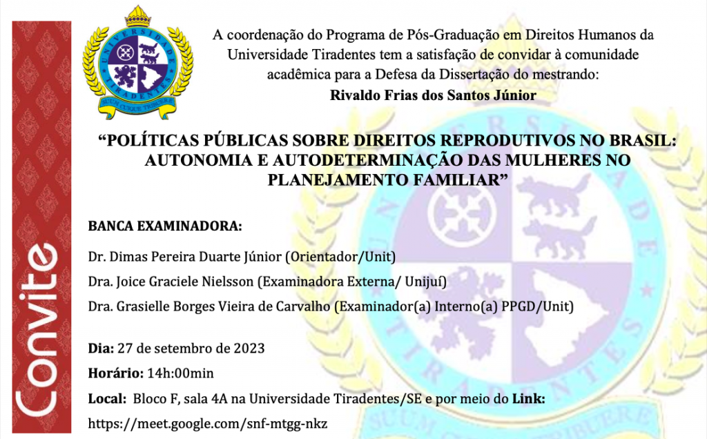 A Coordenação do Programa de Pós-graduação em Direitos Humanos da Universidade Tiradentes/SE tem a satisfação de convidar a comunidade acadêmica para a defesa do(a) mestrando(a) Rivaldo Frias dos Santos Júnior a realizar-se, amanhã, 27 de setembro de 2023, às 14h, na sala 4A do Bloco F.