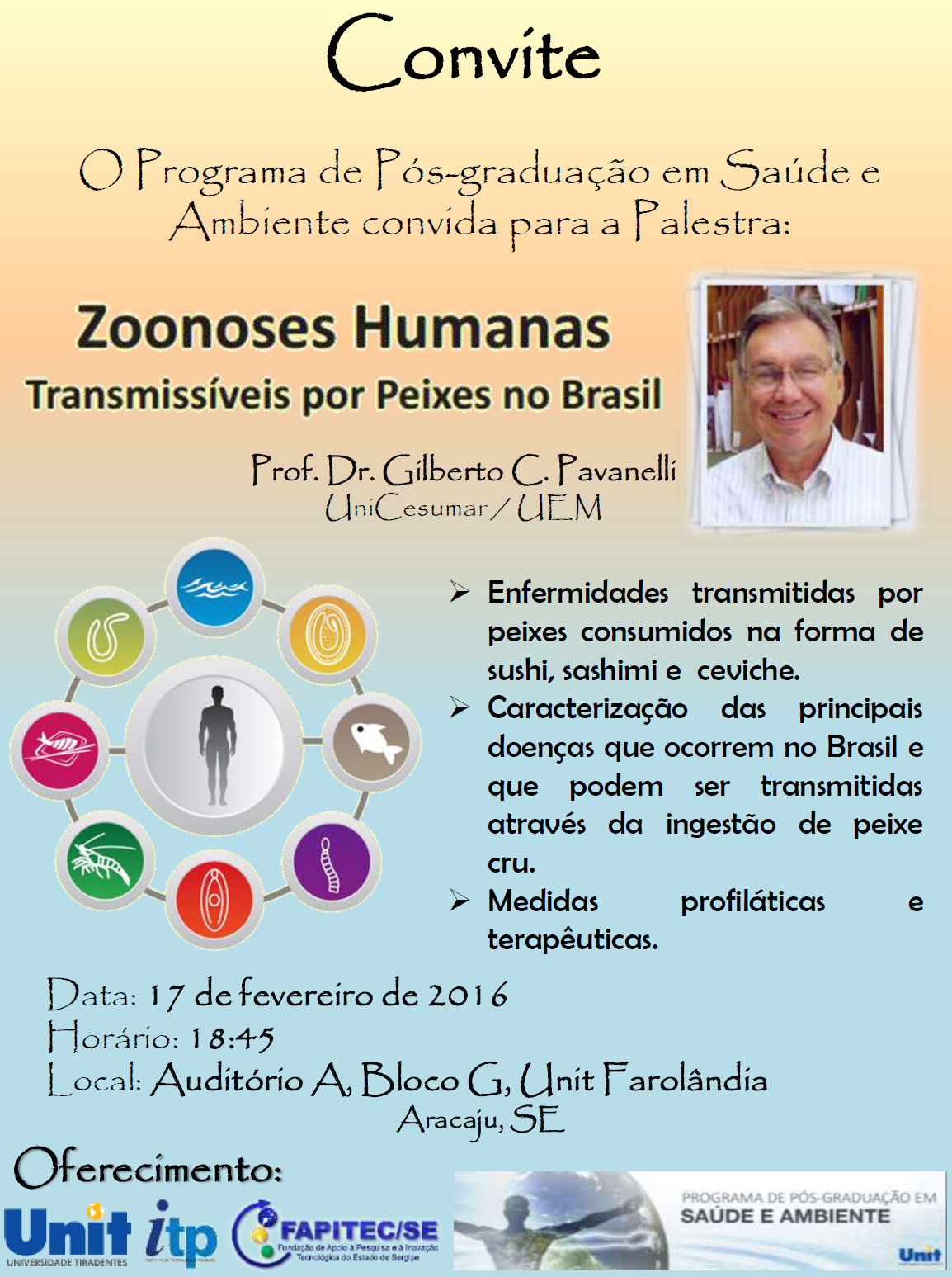 Apesar do consumo de peixe ser um hábito saudável, algumas espécies podem oferecer riscos ao ser humano. É sobre este assunto que o Prof. Dr. Gilberto Cezar Pavanelli, da Universidade Estadual de Maringá irá proferir uma palestra no dia 17 de fevereiro, com o tema “Zoonoses humanas transmissíveis por peixes no Brasil”. O evento será realizado no auditório A, do bloco G, do Campus Farolândia da Universidade Tiradentes, as 18h45.