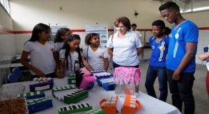 “A gente trouxe o projeto ‘No fole da sanfona’ que começou inicialmente como um projeto junino da escola. Como eu fiquei encarregada da turma do 6º ano e estava trabalhando Geometria, a gente ligou a geometria ao projeto junino. E daí a gente trabalhou a confecção de sanfonas com material reciclável para estudar as formas geométricas. A proposta é ensinar a Matemática de uma maneira lúdica e divertida. Os meninos aprendem e ao mesmo tempo estão se divertindo”, afirma a professora.